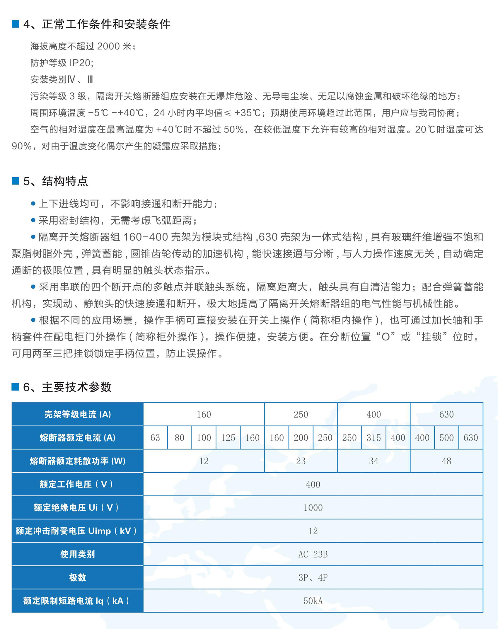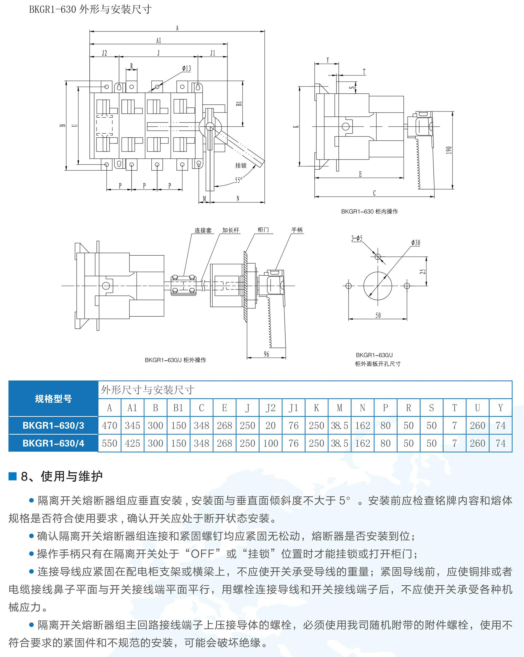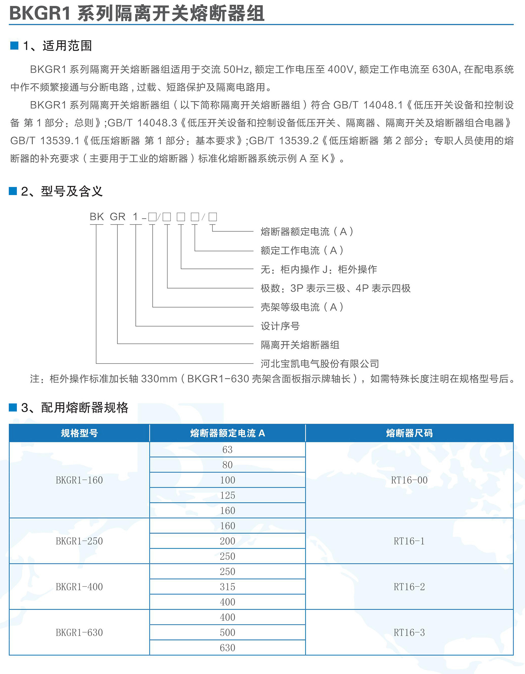 BKGR1系列隔离开关熔断器组适用于交流50Hz,额定工作电压为AC400V,额定工作电流63A-630A的低压配电或电动机网络中,作为不频繁接通、分断电路及线路的隔离之用。可提供短路、过载保护功能。BKGR1系列隔离开关熔断器组符合GB/T 14048.3《低压开关设备和控制设备低压开关、隔离器、隔离开关及熔断器组合电器》。