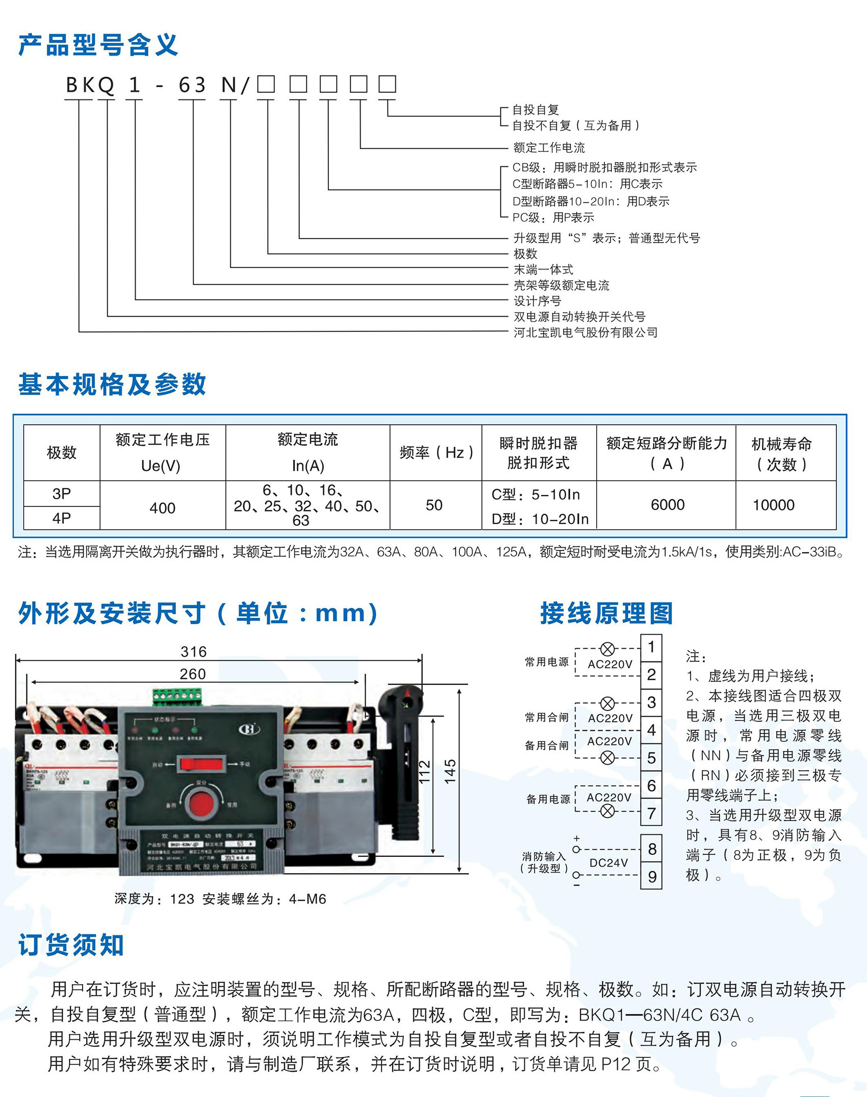 BKQ1-63N末端一体式双电源自动转换开关,适用于交流额定工作电压400V及以下、额定频率50Hz,额定工作电流63A及以下的双电源切换供电系统;产品具有电气联锁与机械联锁,确保两路电源不能同时供电;切换可靠,手动、自动切换均可;新型机构驱动完成切换过程,具有平衡、无噪音、冲击力小的优点;广泛适用于医院、商场、银行、消防、通讯、高层建筑等不允许停电的供电场所。产品符合GB/T 14048.11《低压开关设备和控制设备 第 6-1 部分:多功能电器 转换开关电器》。